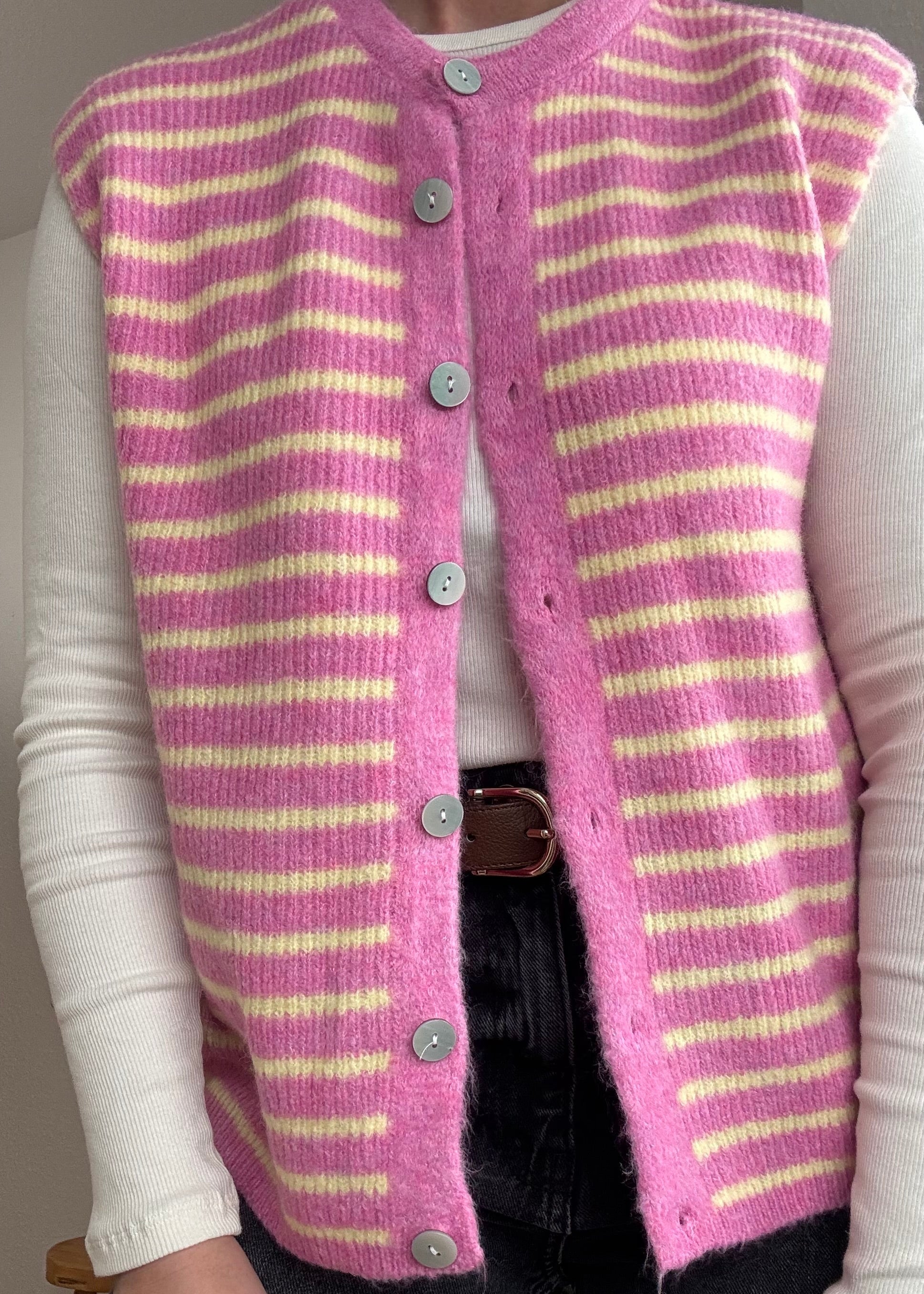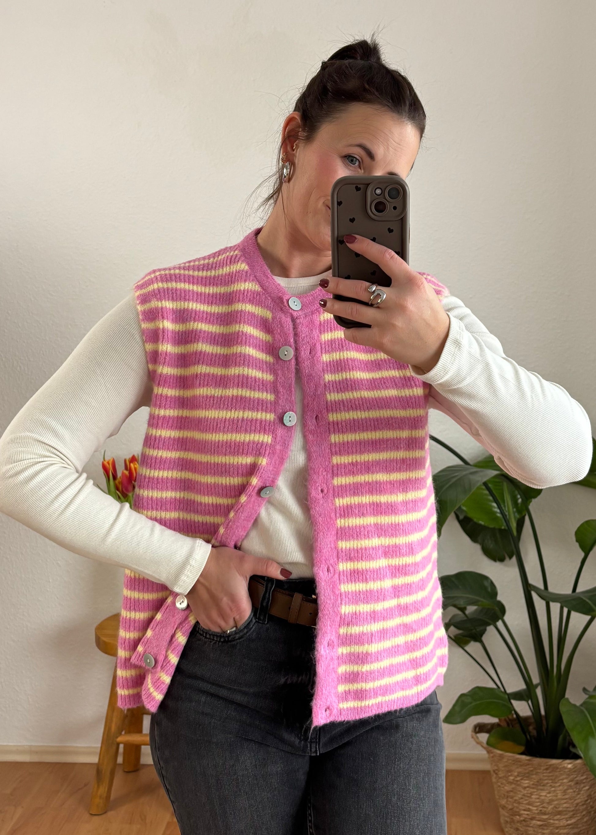 Diese locker geschnittene Strickweste im Streifen-Design ist ein echtes Kombinationswunder. Ob über Blusen, Longsleeves oder Kleidern – sie lässt sich ideal in deine Alltagslooks integrieren und sorgt immer für einen stilvollen Auftritt.